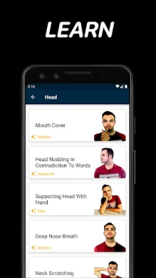 Ontdek de geheimen van menselijke interactie. Deze app verdiept uw inzicht in lichaamstaal en non-verbale signalen. Leer verborgen emoties te herkennen, te doorgronden en verbeter uw communicatievaardigheden aanzienlijk. Dit leidt tot sterkere verbindingen en een beter begrip van anderen.