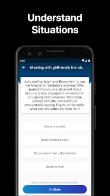 Verdiep uw psychologisch inzicht met interactieve Situaties: korte verhalen die u uitnodigen om met meerkeuzevragen uw begrip van contextueel gedrag te testen. Daarnaast kunt u uw kennis en beheersing van lichaamstaal op de proef stellen met meer dan 100 vragen, verdeeld over 8 uiteenlopende tests. Een groot deel van de functionaliteit is altijd en overal beschikbaar, aangezien de meerderheid van de content offline werkt; alleen voor de rijk geïllustreerde foto's en video's is een internetverbinding nodig. Of u nu van nature extravert bent of zich bevindt binnen het autismespectrum, deze applicatie is ontworpen om uw begrip van psychologie en menselijke interactie significant te verbeteren. Het is bovendien gestructureerd volgens het microlearning-principe, zodat u flexibel en in uw eigen tempo kunt leren, precies wanneer het u uitkomt.