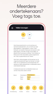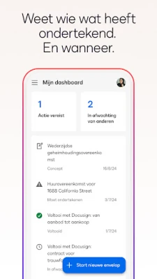 Met Docusign wordt ondertekenen op uw mobiele apparaat verrassend eenvoudig en bovendien geheel kosteloos. Plaats uw handtekening of paraaf met uw vinger, een digitale pen, door een afbeelding te uploaden of kies uit de elegante, vooraf opgemaakte stijlen van Docusign. U kunt eenvoudig uw persoonlijke gegevens toevoegen, zoals uw naam, functie of adres. Wilt u documenten door anderen laten ondertekenen? Met Docusign verstuurt u ze met een paar tikken, stelt u een specifieke ondertekeningsvolgorde in voor meerdere partijen en ontvangt u real-time meldingen zodra een overeenkomst voltooid is. Bij registratie ontvangt u bovendien drie gratis verzoeken om ondertekening, zodat u direct aan de slag kunt.