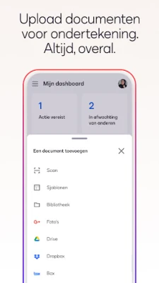 Docusign biedt ongekende flexibiliteit in documentbeheer. Importeer moeiteloos bestanden vanuit uw e-mail of populaire cloudservices zoals Dropbox, Box, Google Drive, Evernote en Salesforce, en sla al uw ondertekende documenten veilig en automatisch op in de cloud. De applicatie ondersteunt vrijwel elk documentformaat, van PDF en Word tot Excel en diverse afbeeldingstypen, wat zorgt voor naadloze integratie in uw workflow. Voor bestaande Docusign-gebruikers verbindt deze app direct met uw account, waardoor u uw werkzaamheden ononderbroken voortzet, waar u ook bent. Vertrouw op de ongeëvenaarde veiligheid en rechtsgeldigheid van Docusign; elke ondertekening is juridisch bindend en wordt ondersteund door een compleet controletraject, dat precies bijhoudt wie, wanneer en wat heeft ondertekend.