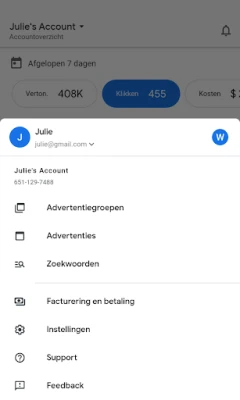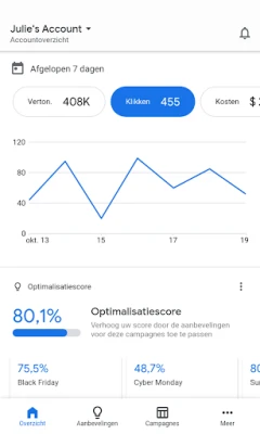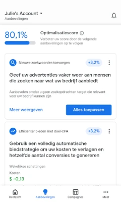 De Google Ads-app is meer dan alleen een beheertool; het is uw persoonlijke gids naar betere prestaties. Ontvang waardevolle, op maat gemaakte aanbevelingen door uw optimalisatiescore te raadplegen, en pas deze inzichten toe om de effectiviteit van uw campagnes te maximaliseren. U blijft voortdurend geïnformeerd dankzij realtimemeldingen en waarschuwingen, variërend van gedetailleerde prestatieoverzichten tot belangrijke notificaties over afgekeurde advertenties. En mocht u toch vragen hebben of extra ondersteuning nodig hebben, dan staat er altijd een supportspecialist van Google voor u klaar, bereikbaar via telefoon of chat, ongeacht uw locatie.