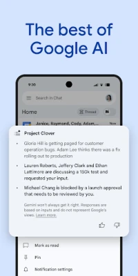 Optimaliseer teamcommunicatie met Chat, de intelligente berichtendienst van Google Workspace, naadloos verrijkt door Gemini. Ervaar een revolutie in uw dagelijkse interacties dankzij functies die u helpen gefocust te blijven. Ontvang compacte samenvattingen van gesprekken, doorbreek taalbarrières met automatische vertalingen naar meer dan 120 talen, en vind razendsnel informatie via onze AI-gestuurde zoekmogelijkheden. Bovendien garandeert Chat dat cruciale actiepunten direct worden vastgelegd en gedeeld, zodat iedereen binnen uw team altijd volledig geïnformeerd is en vooruit kan.