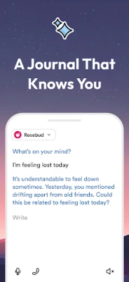 Rosebud transformeert uw dagelijkse reflectie in een verrijkende ervaring. Duik in interactieve dagboekervaringen, verrijkt met realtime begeleiding die perfect aansluit bij zowel tekst- als steminvoeren. Onze zorgvuldig samengestelde gidsen zijn gebaseerd op bewezen psychologische kaders, zoals cognitieve gedragstherapie (CGT) en dankbaarheidspraktijken, om u te helpen bij elke stap. Dankzij geavanceerde AI-technologie leert Rosebud met u mee, herkent het patronen in uw emoties en gedachten en helpt het u bij het identificeren van triggers. Volg uw stemmingen en doelen met slimme trackers, en laat u inspireren door dagelijkse, persoonlijke citaten die resoneren met uw unieke reis. Wekelijkse analyses bieden u diepgaande inzichten in uw vooruitgang, thema's en emotionele landschap, waardoor u bewust kunt groeien.